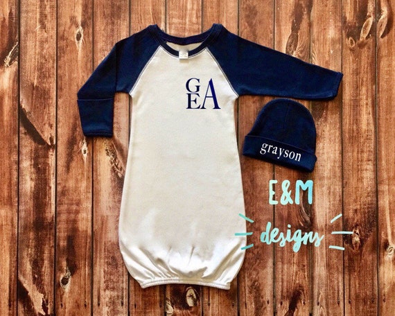 Baby Boy Coming Home Outfit Navy Raglan Baseball Gown Coming Home Outfit Newborn Boy Monogrammed Gown And Hat Set Monogram Boy Newborn