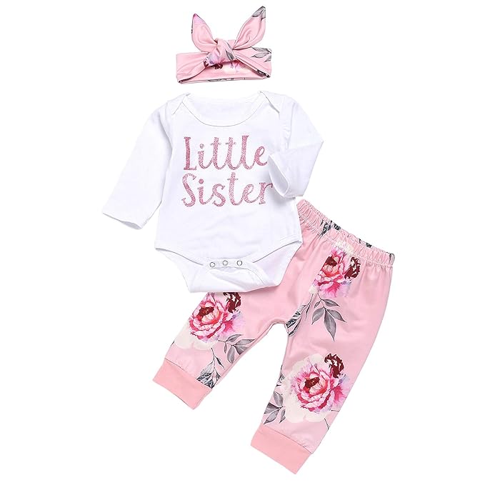 Newborn Baby Girls Outfit Little Sister Letter Romper Floral Print Pants Headband Fall Winter Clothes Set