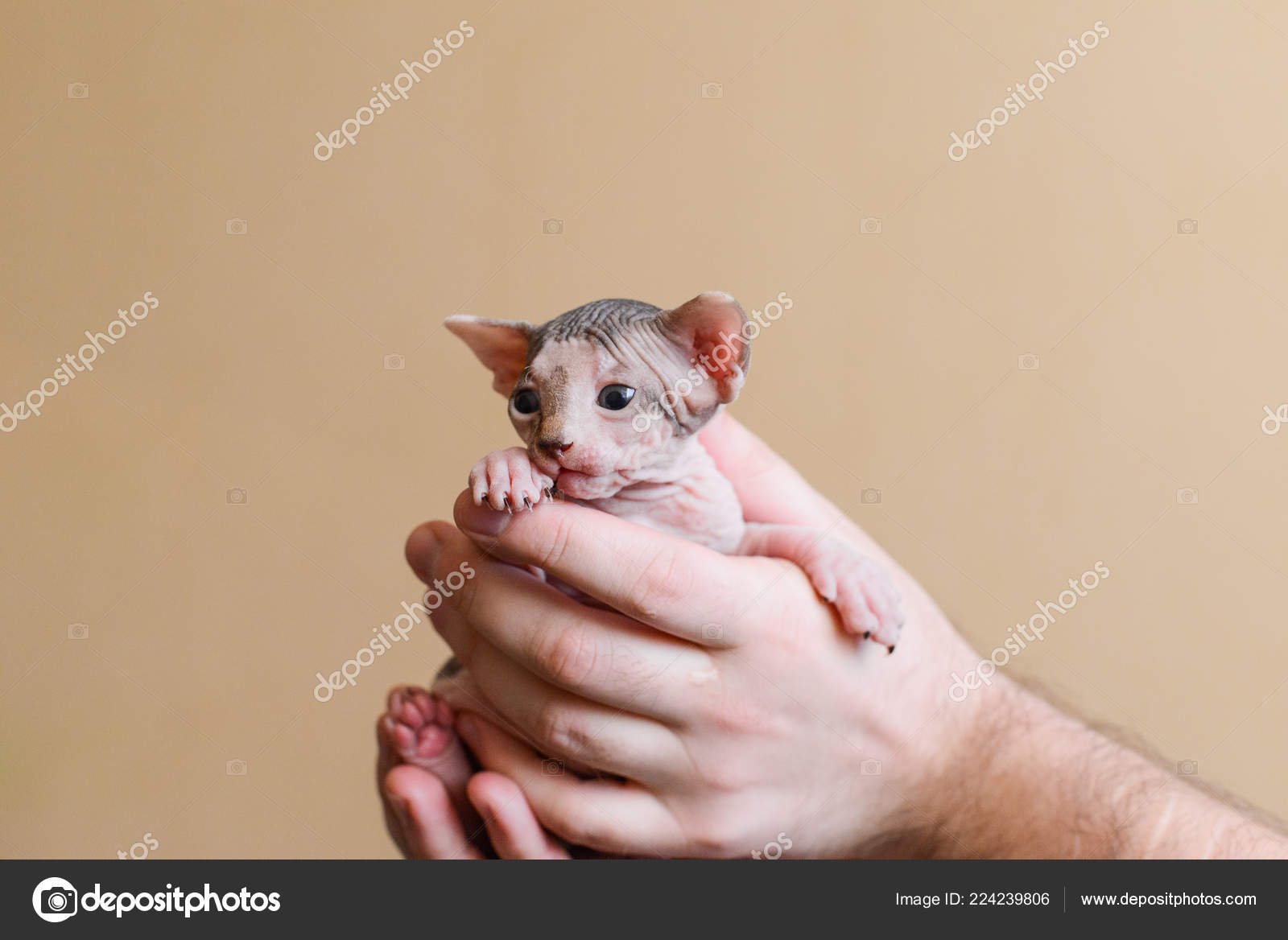 A Newborn Kitten Of The Canadian Sphynx Male Hands