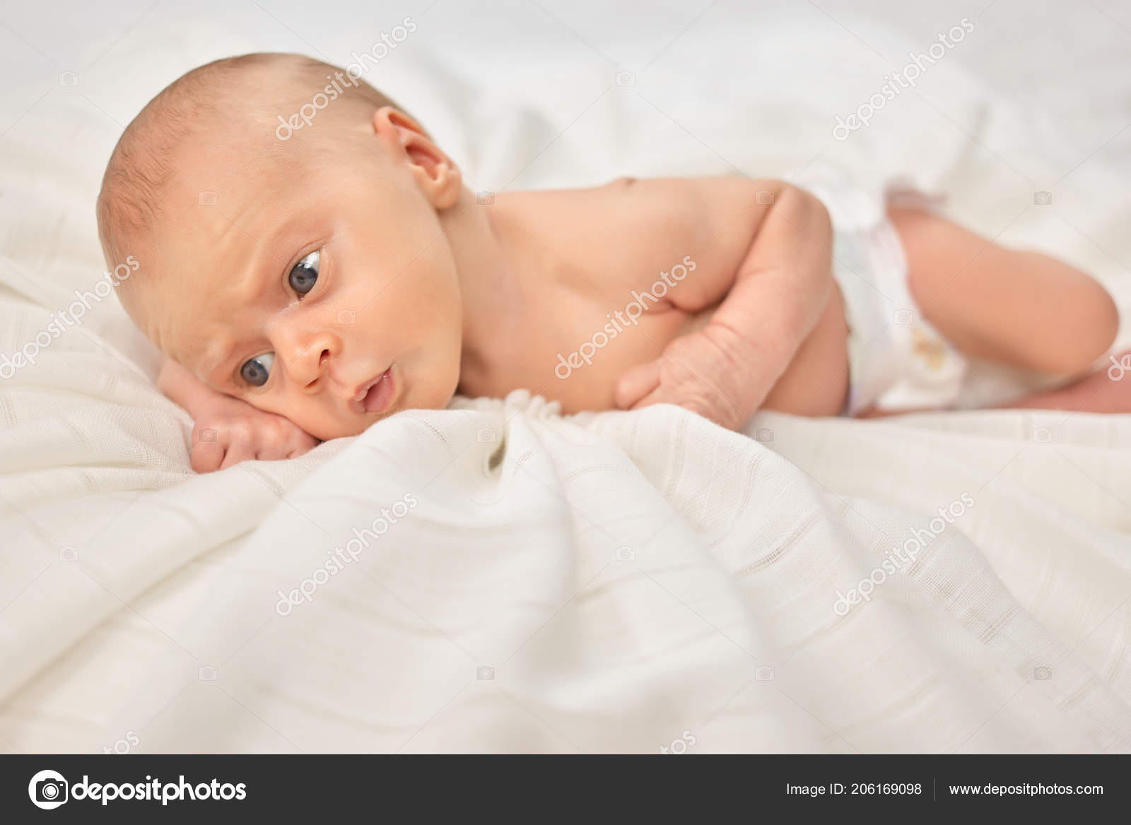 Newborn Naked Baby Child In White Diapers Stock Photo