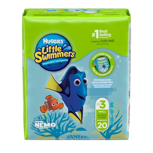 Huggies and pampers swim diapers only have larger sizes with the smallest being 34 16 25 lbs. So when baby pees whether they are wearing a disposable or a reusable swim diaper the pee goes right out the side of the diaper. The same goes for children with diarrhea.