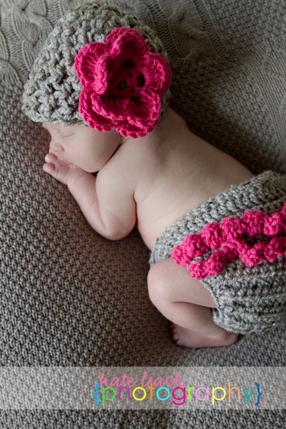 The Emma Beanie In Gray And Hot Pink With Matching Diaper Cover Available In Newborn To 12 Months Made To Order