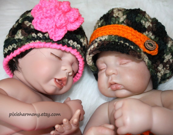 Twin Baby Boy And Girl Camo Hats Or Diapers Camo Orange Pink Ruffle Newborn Photo Prop Made To Order Any Color
