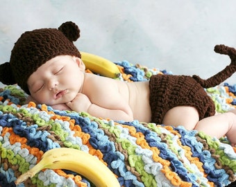Crochet Brown Baby Monkey Hat And Diaper Cover Set With Tail